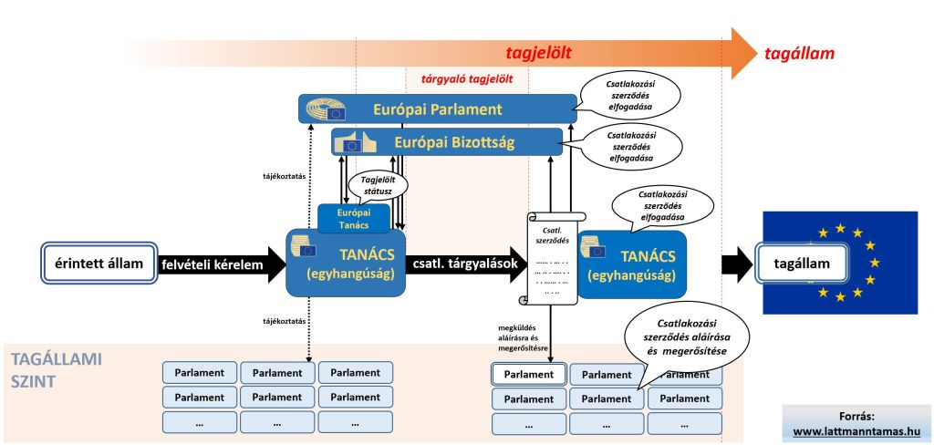 Egy új tagállam csatlakozása az Európai Unióhoz hosszú, több szakaszból álló folyamat, amelynek során a tagállamok megkerülhetetlen tényezők, akármit is delirálnak egyesek “Brüsszelről”, meg annak ilyen-olyan szándékairól. Természetesen ahogy szinte minden esetben, az ún. “brüsszeli bürokrácia”, az EU működtetéséért felelős Európai Bizottság szerepe jelentős, de nem döntő. Segíti a tagállamokat, előkészíti a döntést, de érdemben nem dönt a kérdésekben. (Ahogy az uniós jog megalkotásánál is: előkészít, javaslatot tesz, kezdeményez, de magát a jogszabályt a tagállamokat képviselő Tanács és az Európai Parlament fogadja el.) Akár tetszik, akár nem (újra), az Európai Unió egy nemzetközi szervezet, amelynek keretében a legfontosabb döntéseket a szuverén tagállamok hozzák meg, és annak eldöntése, hogy ők maguk közé fogadnak-e egy újabb tagot (vagy nem) ebbe a szervezetbe, azt ők döntik el. Hiszen az az alapító szerződések módosítását is jelenti, amit a tagállamokon kívül más nem tehet meg. (Ez nem csupán nemzetközi jogi elméleti evidencia, de az államok töretlen gyakorlata is, minden területen.) Ezt rajzolja körbe az alapító szerződésekbe foglalt és lényeges pontjain határozottan le is szabályozott eljárás, amit a következő ábra mutat be a maga teljességében:
